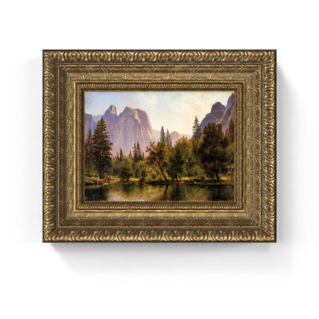 This magnificent framed canvas reproduction of Albert Bierstadt’s Cathedral Rocks, Yosemite Valley has undergone meticulous digital restoration, unlocking an astonishing clarity and vibrant detail that is truly unparalleled. The process has achieved breathtaking sharpness across its vast expanse and remarkable luminosity in its colors, ensuring this masterpiece comes to life on canvas with breathtaking fidelity, offering a truly stunning physical experience. This restoration delivers incredible accuracy to the sun-drenched granite, the shimmering water, and the majestic pines, perfectly capturing the sublime grandeur of this iconic American wilderness.