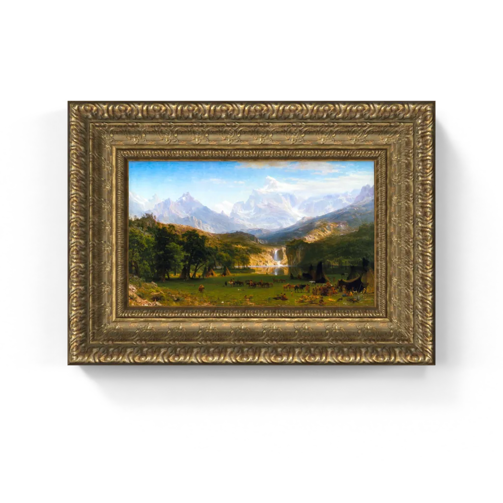 This monumental framed canvas reproduction of Albert Bierstadt’s The Rocky Mountains, Lander's Peak has undergone meticulous digital restoration, unlocking an astonishing clarity and vibrant detail that is truly unparalleled. The process has achieved breathtaking sharpness across its vast panoramic expanse and remarkable luminosity in its colors, ensuring that this masterpiece will translate with breathtaking fidelity onto canvas as a stunning physical product. This restoration delivers incredible accuracy to the brilliant blues of the sky, the lush greens of the meadows, and the ethereal whites of the snow-capped mountains, perfectly capturing the sublime grandeur of the American wilderness.