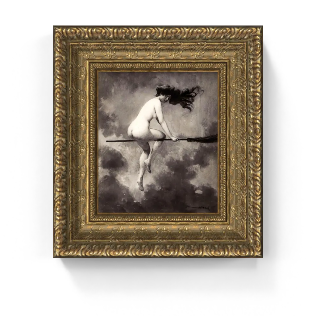 This captivating framed canvas reproduction of Albert Joseph Pénot’s Departure for the Witches' Sabbath, presented here in a masterful black and white restoration, has undergone meticulous digital restoration, unlocking an astonishing clarity and tonal fidelity that is truly unparalleled. The process has revived the exquisite textures of the stormy sky and the luminous contours of the figure's form with precision, ensuring every delicate nuance of light and shadow is perfectly rendered. This meticulous attention ensures this masterpiece comes to life on canvas with breathtaking authenticity, offering a truly stunning physical experience that preserves the painting's original, compelling splendor and profound mystery.