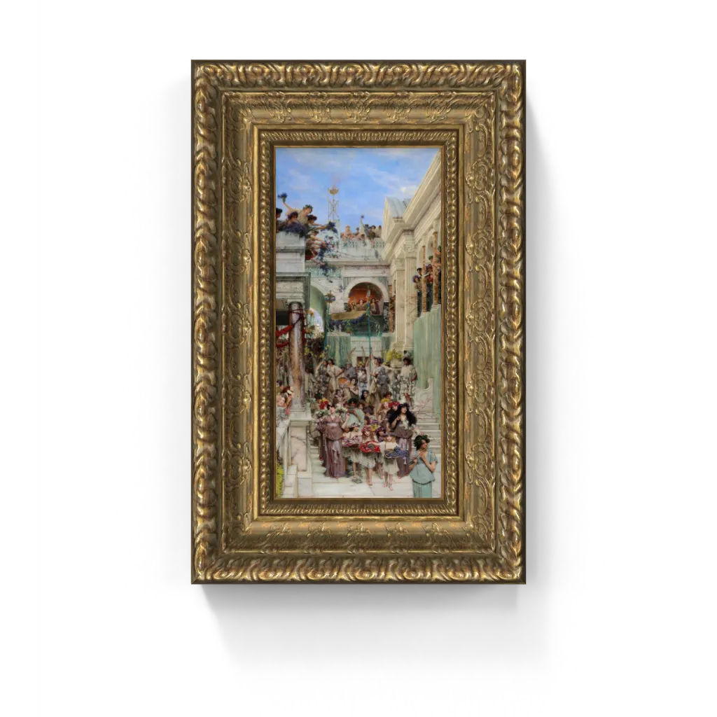 Clothed in flowing robes and adorned with blossoms, the figures move in harmony through a city awash in sunlight and texture. Alma-Tadema’s signature attention to architectural detail is on full display—from the carved columns to the blooming branches overhead—infusing the scene with both grandeur and grace. The result is a romanticized but richly immersive view of a world where beauty, ritual, and nature converge.