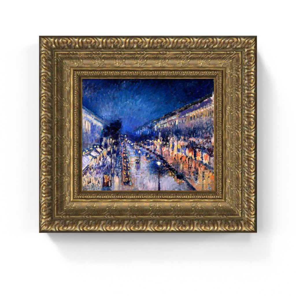 This captivating framed canvas reproduction of Camille Pissarro’s Boulevard Montmartre at Night has undergone meticulous digital restoration, unlocking a depth and vibrancy often lost in typical online versions. The process has achieved unparalleled richness in the nocturnal blues and purples, creating a profoundly immersive nighttime atmosphere. Furthermore, the restoration delivers exceptionally vibrant and distinct artificial lights, with the streetlamps and illuminated windows glowing brilliantly, and the shimmering reflections on the wet pavement rendered with breathtaking luminosity and clarity.