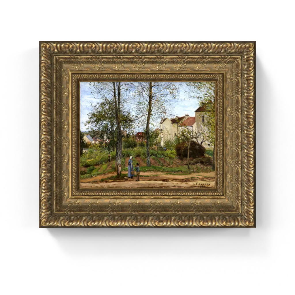 This premium framed canvas reproduction beautifully conveys the vibrant luminosity and intricate texture of Pissarro's original, now with an unparalleled clarity that truly brings the artwork to life. It is a splendid addition for spaces favoring classic elegance, a touch of historical charm, or a serene rural aesthetic, perfectly suiting traditional or French Country decor.