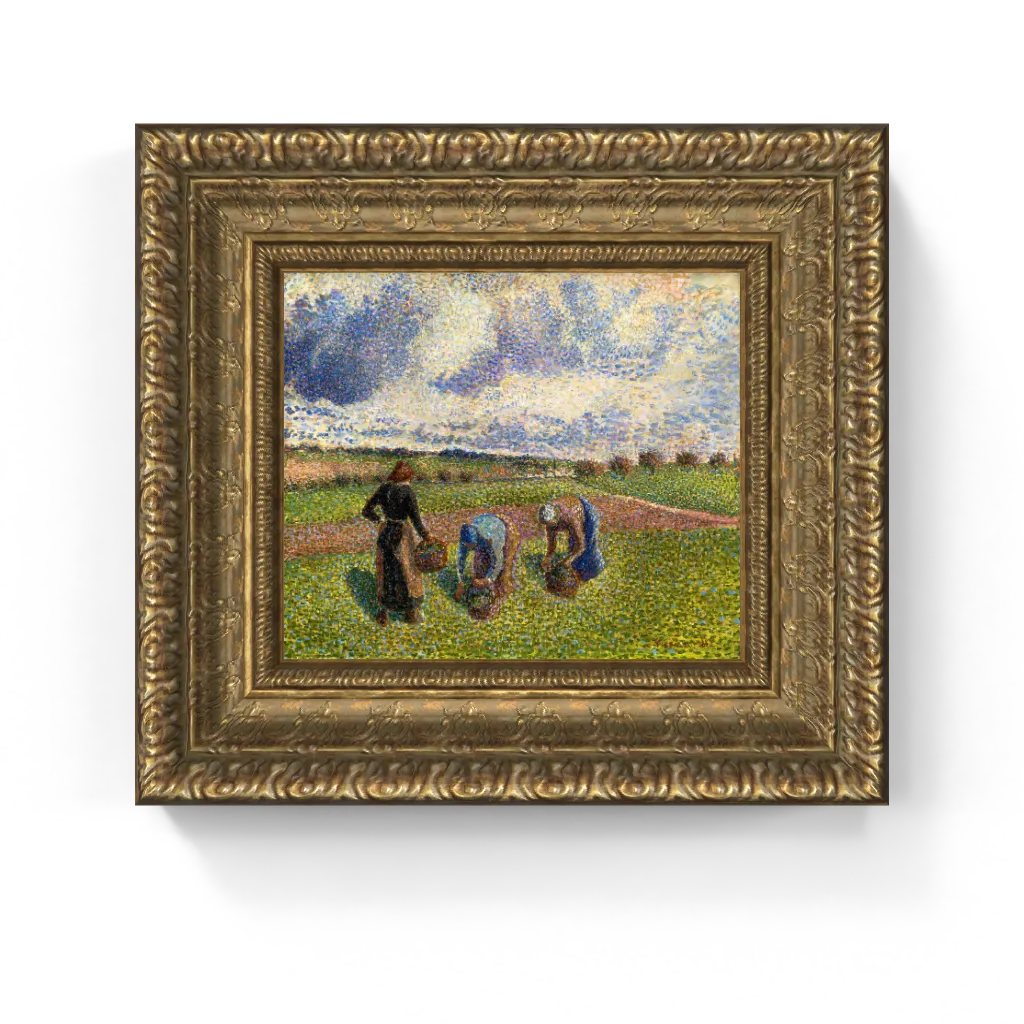 This extraordinary framed canvas reproduction of Camille Pissarro's Peasant Women Gathering Herbs has undergone meticulous digital restoration, revealing the true brilliance of its Pointillist technique often obscured in typical reproductions. The process has achieved unparalleled clarity and definition in the individual color dots, allowing the eye to truly engage with their optical mixing and perceive the intended luminosity. Furthermore, the restoration delivers richer, more accurate color vibrancy across the vibrant greens of the field and the complex blues of the sky, presenting Pissarro's innovative vision with breathtaking fidelity.