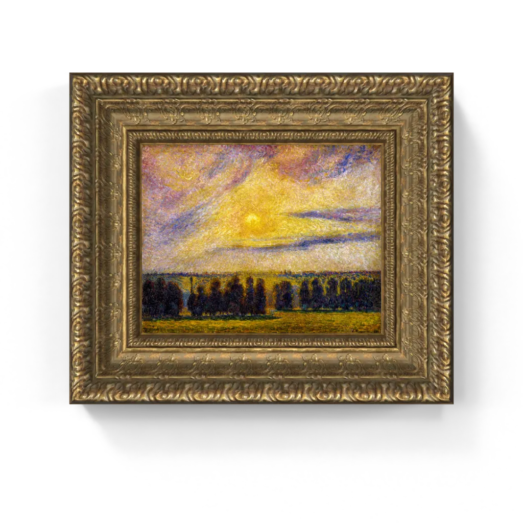 This magnificent framed canvas reproduction of Camille Pissarro's Sunset at Éragny has undergone masterful digital restoration, elevating its visual impact far beyond typical online renditions. The process has achieved unparalleled luminosity in the sky's vibrant yellows and oranges, capturing the intense glow of the setting sun with breathtaking fidelity. Furthermore, the restoration reveals the rich impasto and distinct brushwork with remarkable clarity, allowing the viewer to fully appreciate the textural depth and atmospheric brilliance of Pissarro's hand.