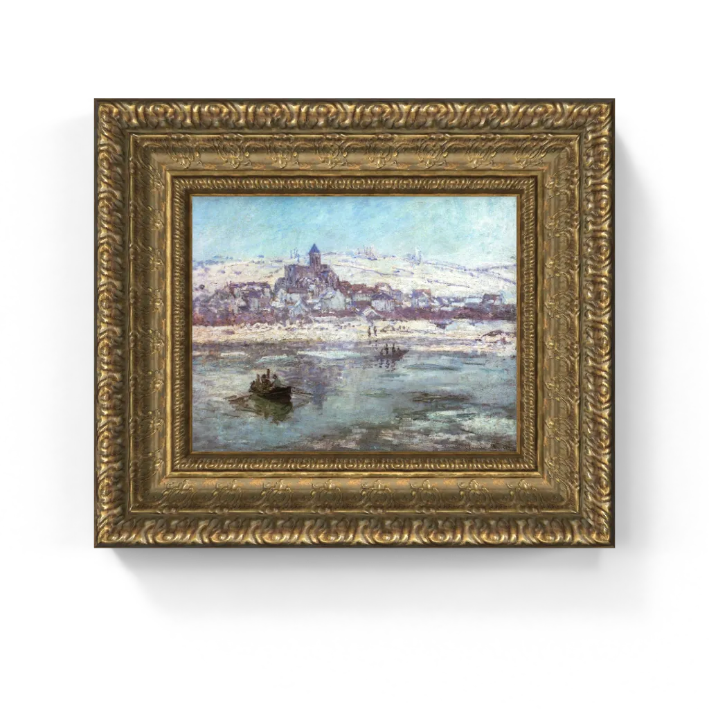 The canvas is a symphony of cool tones – luminous whites, delicate blues, and soft grays define the snow-covered village and the frozen, shimmering river. The houses of Vétheuil and the prominent church steeple are nestled on the hillside, their forms softened by the blanket of snow and the diffused light of a winter sky. In the foreground, scattered ice floes on the water reflect the muted light, while small boats with figures suggest the continued rhythm of life despite the cold. Monet's characteristic loose, visible brushstrokes brilliantly convey the texture of the snow, the chill in the air, and the unique reflections on the icy surface. This painting is a profound meditation on the resilience of life amidst desolation and the austere beauty of a winter landscape.