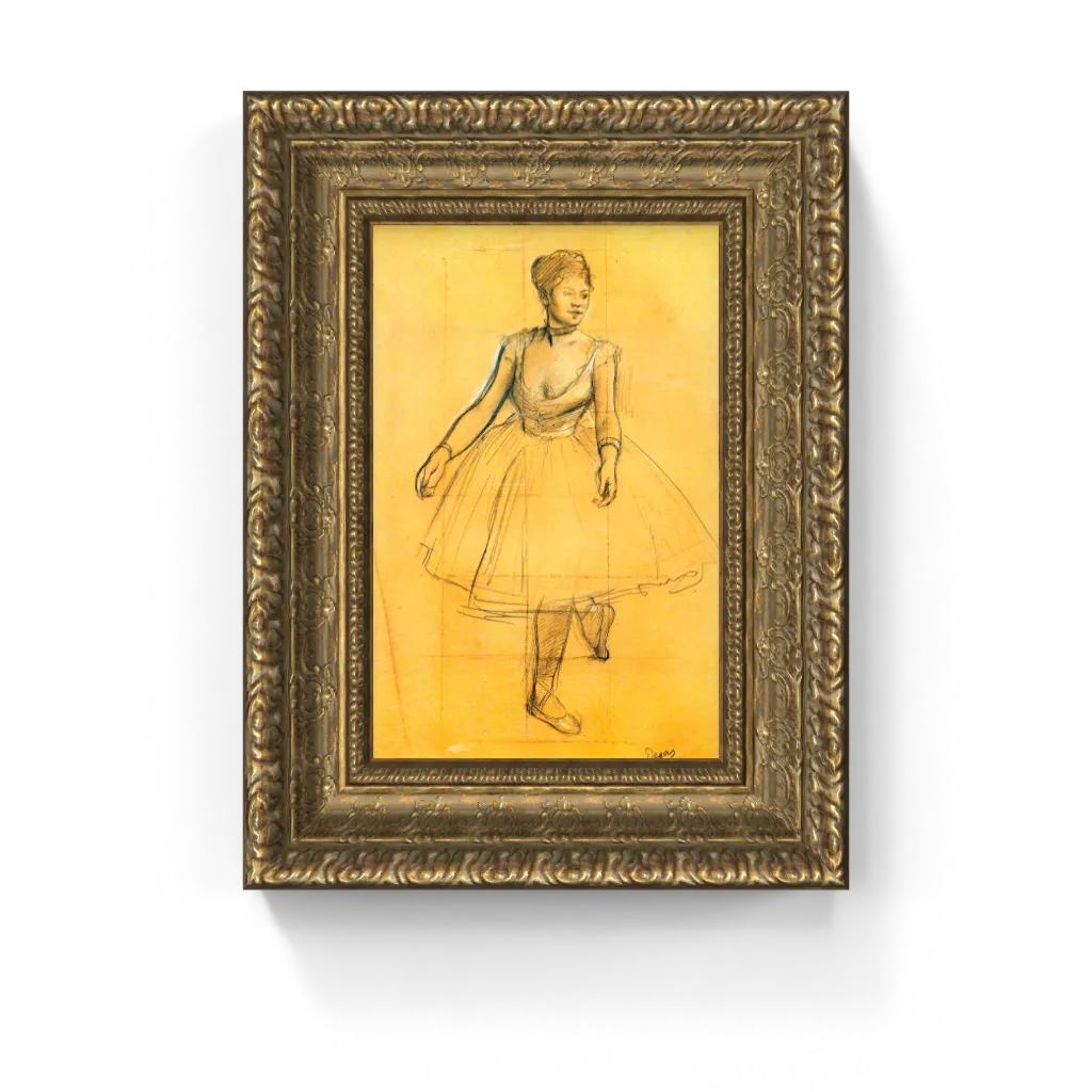This captivating framed canvas reproduction of Edgar Degas’s Ballet Dancer in Position has undergone meticulous digital restoration, unlocking an astonishing clarity and vibrant fidelity that is truly unparalleled. The process has revived the luminous glow of the paper and the exquisite texture of the delicate charcoal and pastel strokes with precision, ensuring every bold line and subtle shade is perfectly rendered. This meticulous attention ensures this masterpiece comes to life on canvas with breathtaking authenticity, offering a truly stunning physical experience that preserves the drawing's original, compelling splendor and profound dynamism.