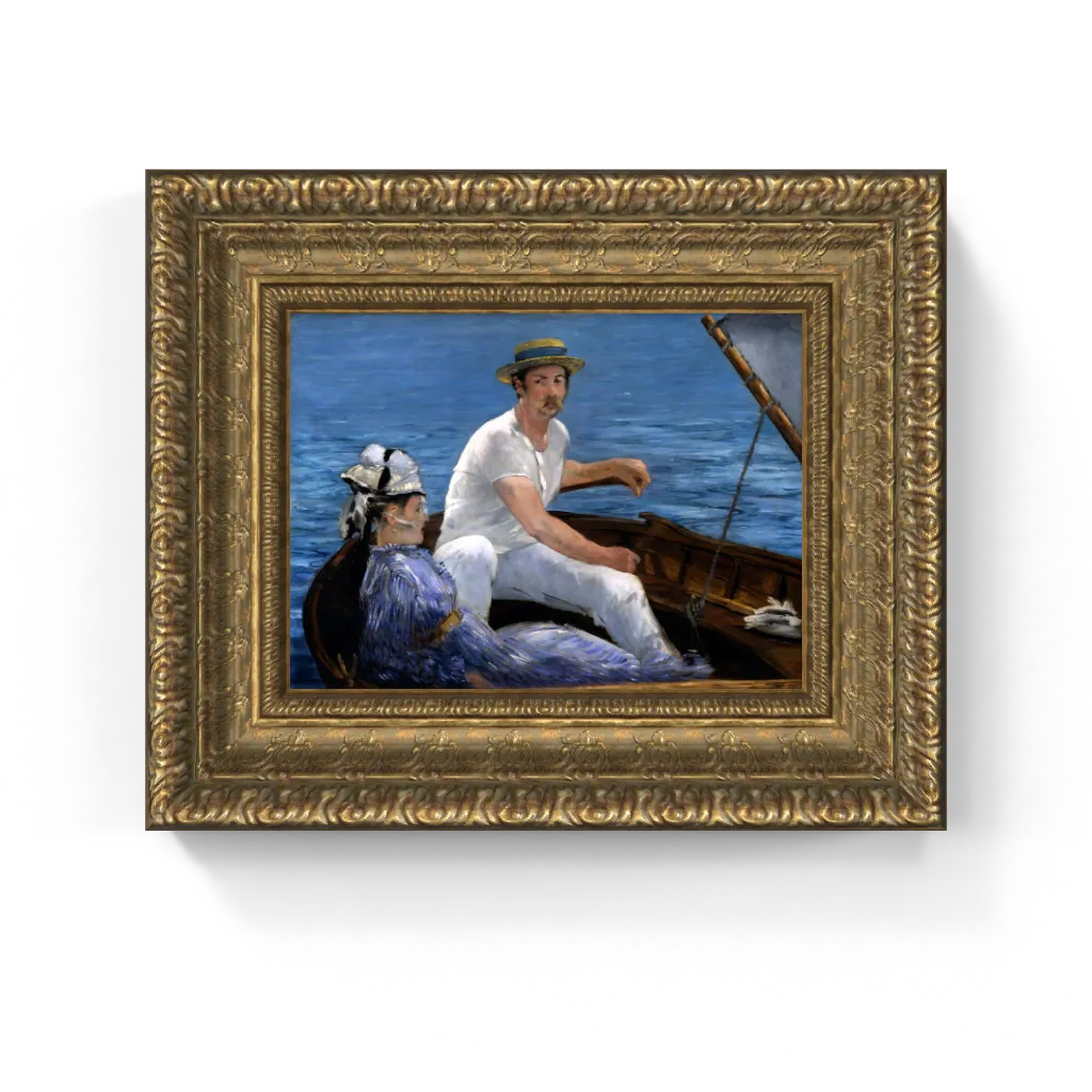 Light, leisure, and modernity converge in Boating, Édouard Manet’s luminous 1874 portrait of Parisian recreation and style along the Seine. This bold and breezy composition presents a fashionable man and woman seated in a small sailboat, the sparkling water and bright sky capturing the Impressionist sensibility of light in motion—yet grounded by Manet’s unshakable sense of structure and presence.