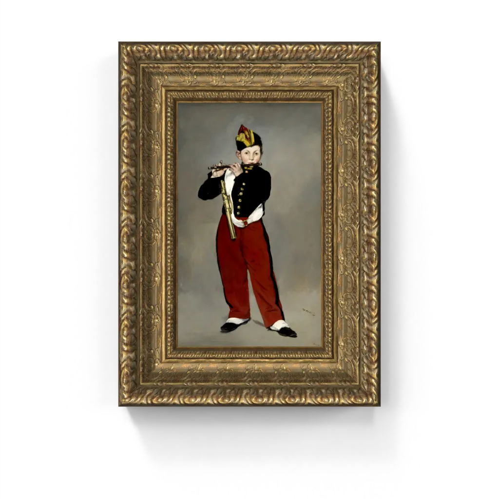 Bold in form and revolutionary in style, The Fifer by Édouard Manet captures the striking simplicity and modern clarity that made him one of the most influential painters of the 19th century. Completed in 1866 after a visit to Spain, this portrait of a young military musician was inspired by Manet’s admiration for Spanish masters like Velázquez, yet departs from tradition with its daring flatness and unapologetic immediacy.