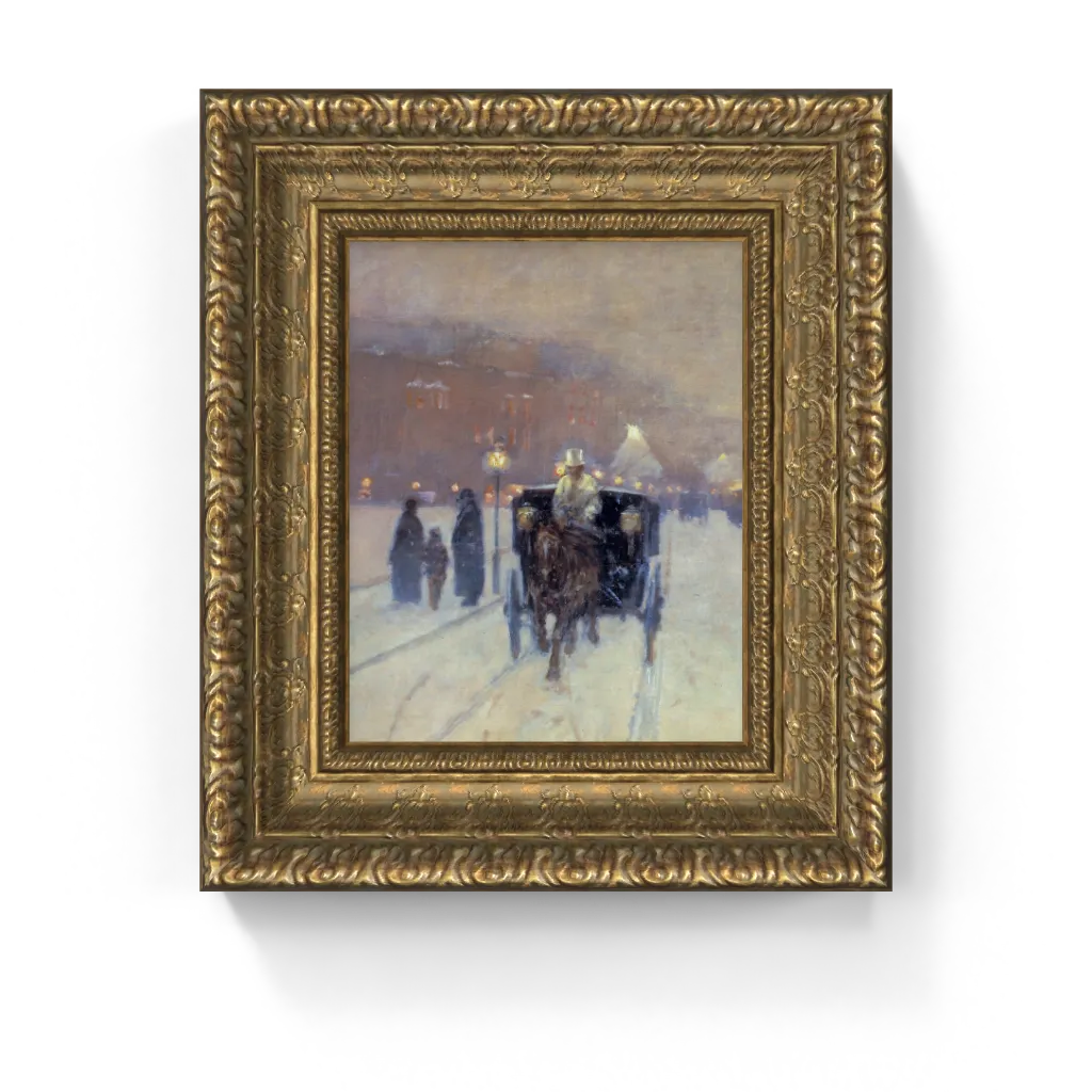 The canvas is a symphony of soft grays, muted whites, and subtle blues, punctuated by the brilliant warm yellows and oranges of the gaslights and distant windows. Hassam's masterful brushwork captures the atmospheric softness of the falling snow, which blurs the distant forms and creates a dreamlike effect. The central horse-drawn carriage, rendered with a sense of graceful motion, provides a focal point, while the dark silhouettes of pedestrians add a human scale to the tranquil scene. The street, covered in a pristine blanket of white, seems to absorb the light, lending an ethereal quality to the moment. This painting is a powerful testament to the beauty and poetic charm that can be found in the everyday rhythms of a city in winter.