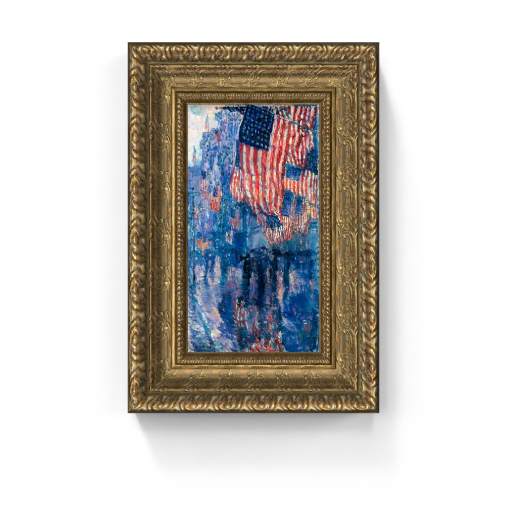 This iconic framed canvas reproduction of Childe Hassam’s The Avenue in the Rain has undergone meticulous digital restoration, unlocking an astonishing clarity and vibrant fidelity that is truly unparalleled. The process has revived the incandescent brilliance of the red, white, and blue flags and the exquisite shimmer of their reflections on the rain-slicked avenue with precision. Adding to its profound historical significance, this very painting was hung in the White House for a time, a testament to its powerful portrayal of American patriotism. This meticulous attention ensures this masterpiece comes to life on canvas with breathtaking authenticity, offering a truly stunning physical experience that preserves the painting's original, dazzling splendor and captivating atmosphere.