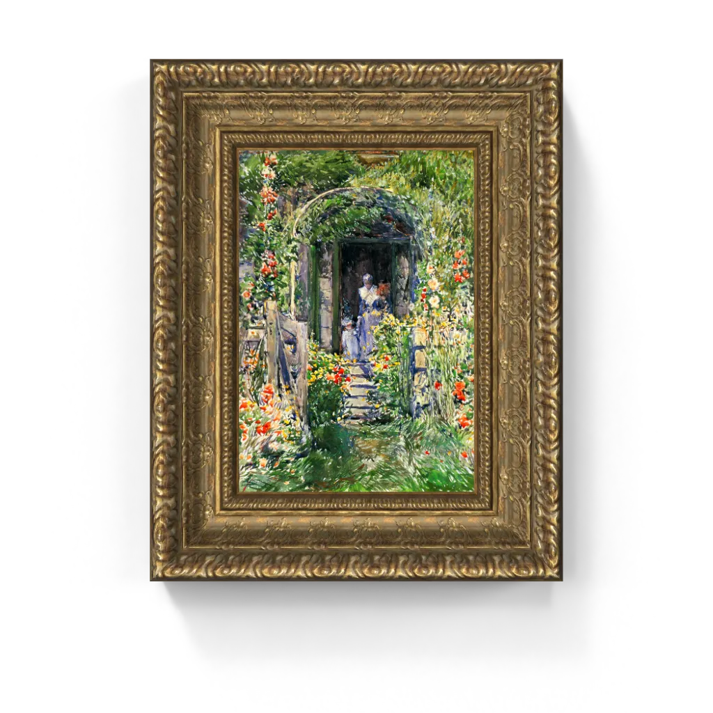 The canvas is a symphony of brilliant reds, yellows, oranges, and greens, dominated by an explosion of flowers that seem to burst from every corner of the scene. The winding path leads towards a charming, arched doorway, where a woman and child stand in a moment of tranquil repose. Hassam's characteristic loose, visible brushstrokes brilliantly convey the texture of the blooming flowers, the lush foliage, and the dappled sunlight that filters through the trees. The overall effect is one of immersive beauty and domestic serenity, a vibrant celebration of a private paradise. This painting is a powerful testament to the enduring joy and artistic resonance found in a garden.