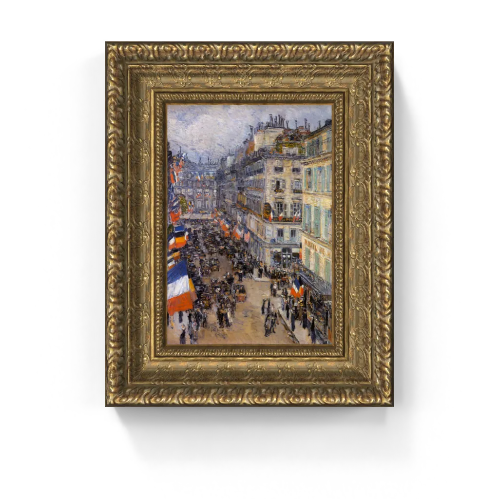 This iconic framed canvas reproduction of Childe Hassam’s July Fourteenth, Rue Daunou has undergone meticulous digital restoration, unlocking an astonishing clarity and vibrant fidelity that is truly unparalleled. The process has revived the incandescent brilliance of the national flags and the exquisite energy of the bustling street scene with precision, ensuring every delicate nuance of light and movement is perfectly rendered. This meticulous attention ensures this masterpiece comes to life on canvas with breathtaking authenticity, offering a truly stunning physical experience that preserves the painting's original, dazzling splendor and captivating atmosphere.