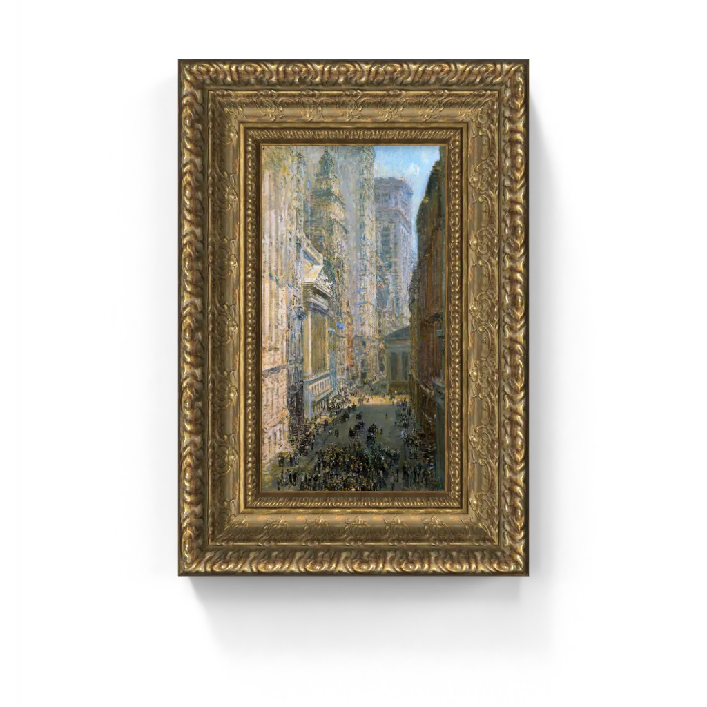 In Lower Manhattan, Childe Hassam, the revered master of American Impressionism, offers a powerful and dynamic vision of the heart of American finance and ambition. Painted in 1910, this work is a quintessential example of Hassam's urban landscapes, where he applied the Impressionist focus on fleeting light and atmosphere to the monumental, vertical cityscapes of New York. The painting depicts a bustling scene in the financial district, with the towering buildings of Wall Street forming a majestic urban canyon.