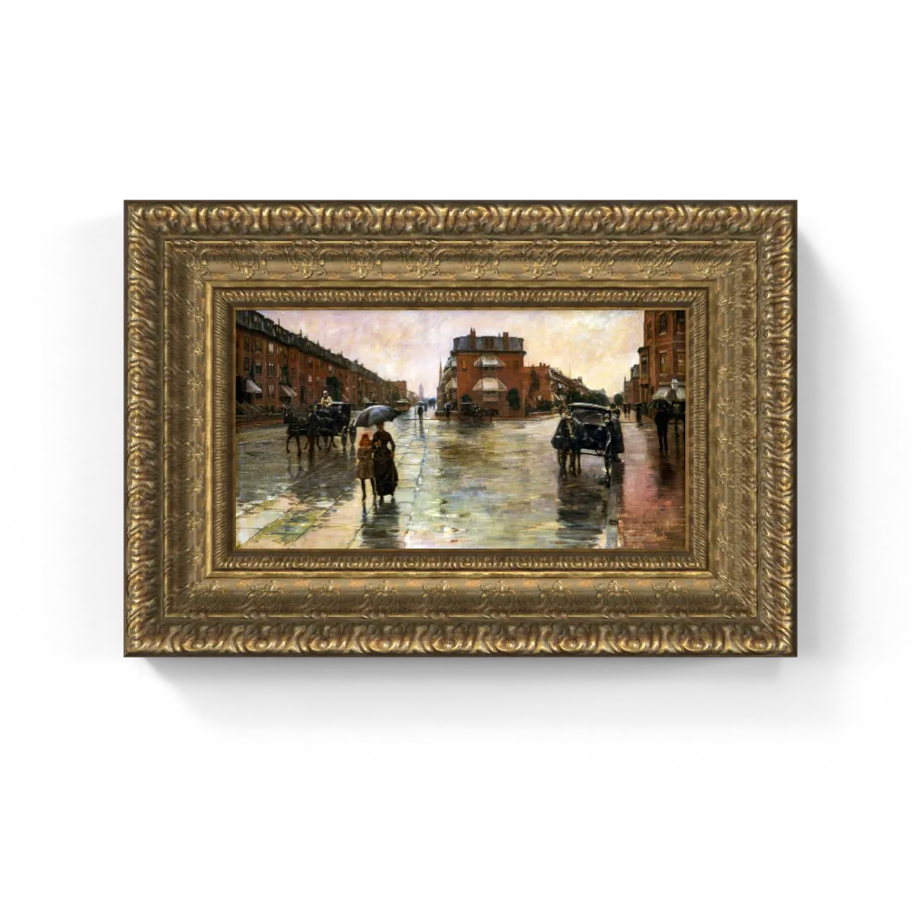 This iconic framed canvas reproduction of Childe Hassam’s A Rainy Day, Boston has undergone meticulous digital restoration, unlocking an astonishing clarity and vibrant fidelity that is truly unparalleled. The process has revived the exquisite shimmer of the rain-slicked pavement and the luminous glow of the atmospheric light with precision, ensuring every delicate nuance of color and texture is perfectly rendered. This meticulous attention ensures this masterpiece comes to life on canvas with breathtaking authenticity, offering a truly stunning physical experience that preserves the painting's original, captivating splendor and poetic mood.