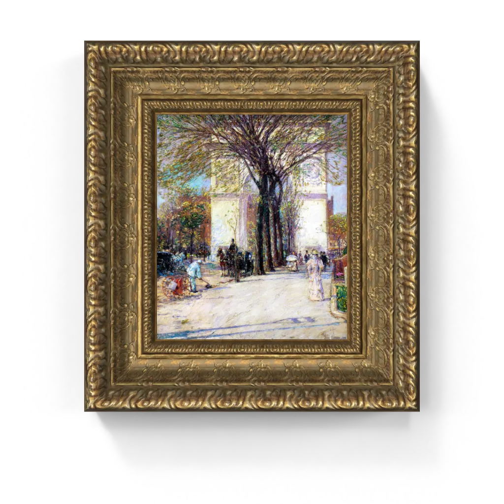 This iconic framed canvas reproduction of Childe Hassam’s Washington Arch in Spring has undergone meticulous digital restoration, unlocking an astonishing clarity and vibrant fidelity that is truly unparalleled. The process has revived the incandescent brilliance of the spring light and the fresh, luminous greens of the foliage with precision, ensuring every delicate nuance of light and movement is perfectly rendered. This meticulous attention ensures this masterpiece comes to life on canvas with breathtaking authenticity, offering a truly stunning physical experience that preserves the painting's original, dazzling splendor and captivating atmosphere.
