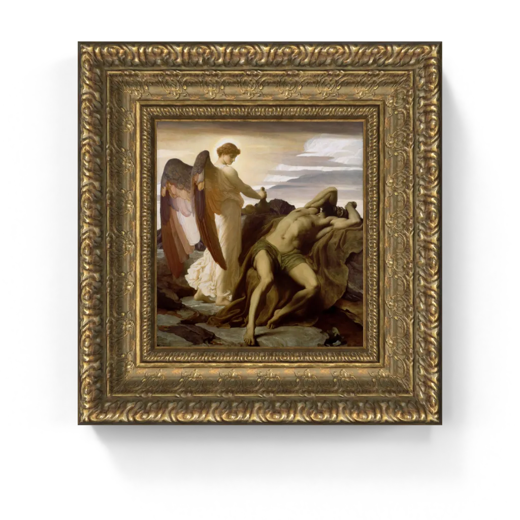 This emotionally profound framed canvas reproduction of Frederic Leighton’s Elijah in the Wilderness has undergone meticulous digital restoration, unlocking an astonishing clarity and vibrant fidelity that is truly unparalleled. The process has revived the ethereal luminosity of the angel's form and the subtle warmth of Elijah's skin with exquisite precision, ensuring every delicate feather and textural detail is perfectly rendered. This meticulous attention ensures this masterpiece comes to life on canvas with breathtaking authenticity, offering a truly stunning physical experience that preserves the painting's original, spiritual beauty and dramatic impact.