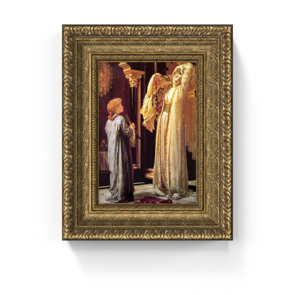 This premium framed canvas reproduction powerfully conveys the dazzling opulence and profound aesthetic beauty of Leighton's original, now with an enhanced clarity that brings every intricate detail to life. It is an exceptional statement piece for any sophisticated living space, a focal point that offers both visual splendor and a captivating glimpse into a world of luxury and timeless beauty, perfectly suiting classic, elegant, literary, or richly adorned decor styles.