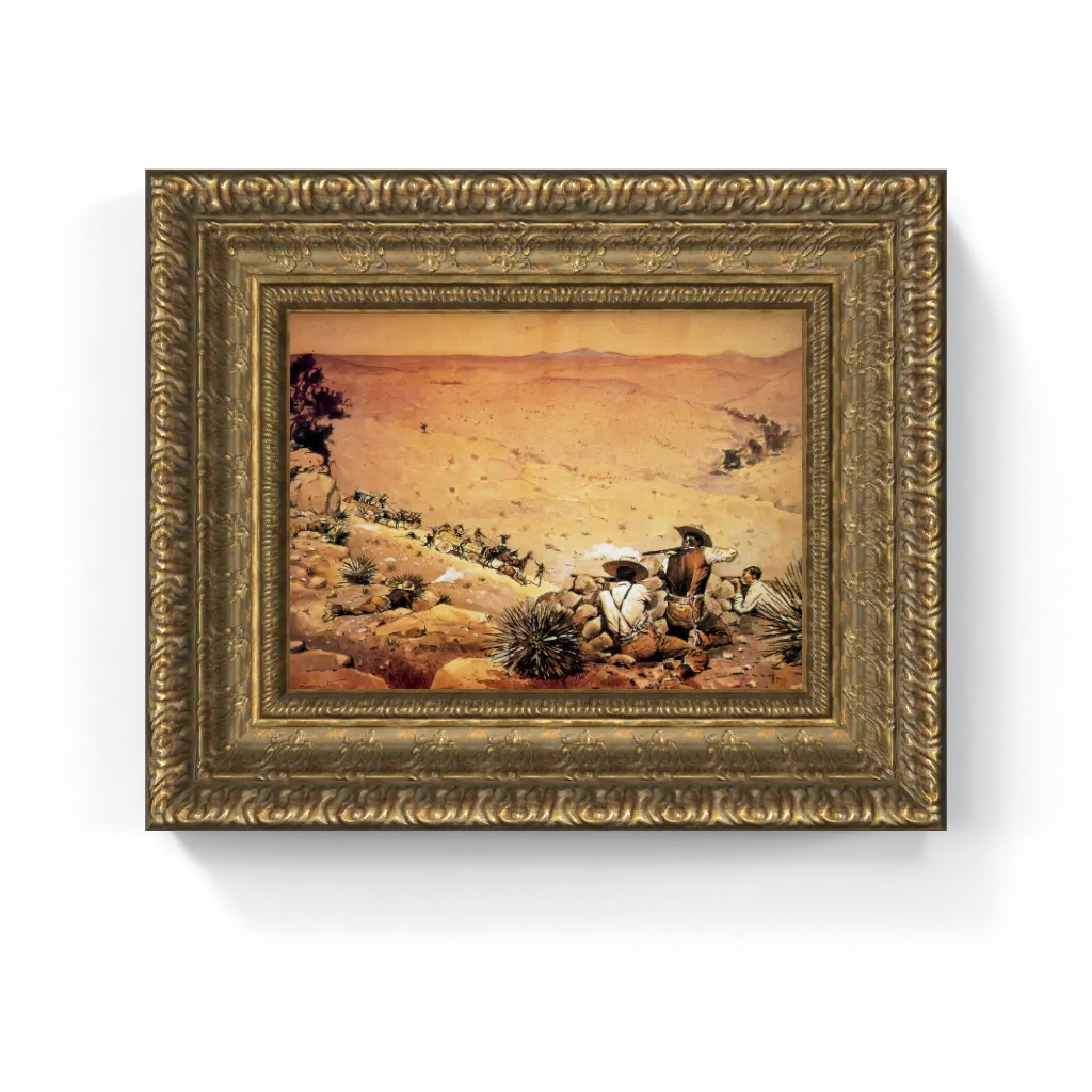 This dramatic framed canvas reproduction of Frederic Remington’s The Hold Up has undergone meticulous digital restoration, unlocking an astonishing clarity and vibrant fidelity that is truly unparalleled. The process has revived the intense warmth of the sun-drenched desert and the explosive energy of the action with exquisite precision, ensuring every dynamic detail and subtle nuance of the rugged terrain is perfectly rendered. This meticulous attention ensures this masterpiece comes to life on canvas with breathtaking authenticity, offering a truly stunning physical experience that preserves the painting's original, compelling narrative and vivid atmosphere.