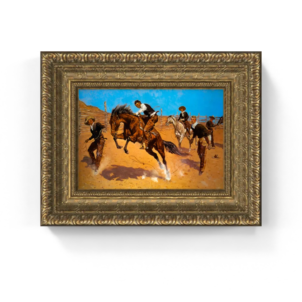 This electrifying framed canvas reproduction of Frederic Remington’s Turn Him Loose, Bill has undergone meticulous digital restoration, unlocking an astonishing clarity and vibrant fidelity that is truly unparalleled. The process has revived the raw energy of the dusty arena and the powerful musculature of the bucking horse with exquisite precision, ensuring every dynamic detail and expression is perfectly rendered. This meticulous attention ensures this masterpiece comes to life on canvas with breathtaking authenticity, offering a truly stunning physical experience that preserves the painting's original, compelling action and vivid spirit.