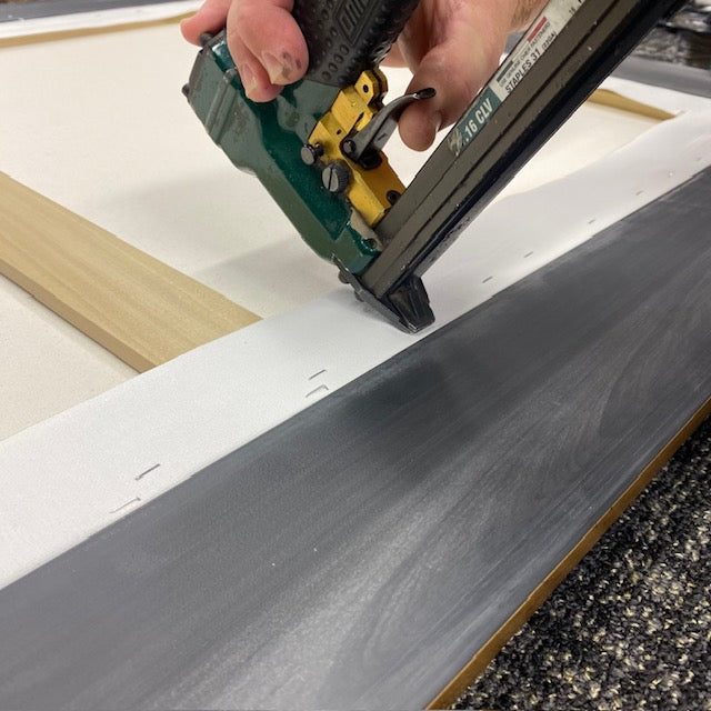 The stretched and embellished canvas is carefully secured to the frame with furniture grade staples and plywood corner gussets are added to the frame for additional structural integrity.
