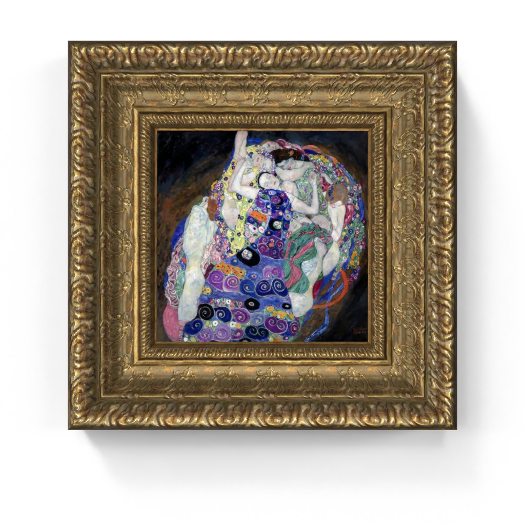 At the heart of The Virgin lies a swirling arrangement of six intertwined female figures encircling a central maiden—possibly representing the Virgin herself—lost in serene contemplation. Their bodies seem to drift through a celestial space, enveloped by richly ornamented fabrics, floral motifs, and flowing hair. Klimt’s masterful use of color, decorative abstraction, and sinuous linework creates a visual rhythm that draws the viewer into a hypnotic dance of emotion, desire, and renewal.