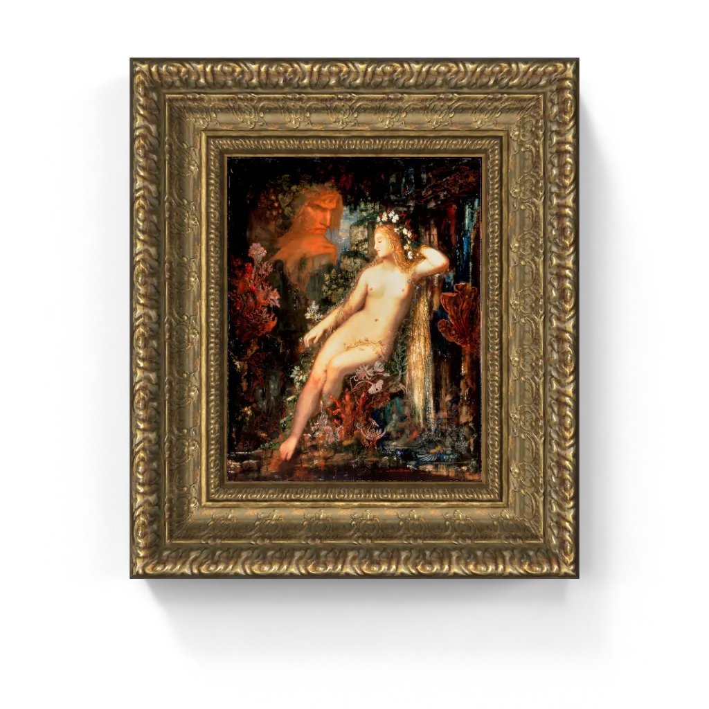 This premium framed canvas reproduction powerfully conveys the dazzling opulence and profound narrative of Moreau's original, now with an enhanced clarity that brings every intricate detail to life. It is an exceptional statement piece for any sophisticated living space, a focal point that offers both visual splendor and a captivating journey into a world of myth, desire, and mystical beauty, perfectly suiting classic, elegant, literary, or richly dramatic decor styles.