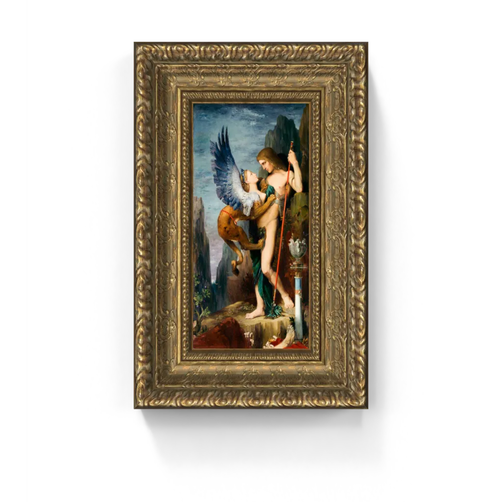 This iconic framed canvas reproduction of Gustave Moreau’s Oedipus and the Sphinx has undergone meticulous digital restoration, unlocking an astonishing richness and intricate detail often muted in typical online versions. The process has yielded unparalleled vibrancy in the Sphinx's vivid blue wings and Oedipus's drapery, bringing out the painting's symbolic colors with breathtaking brilliance. Furthermore, the restoration delivers remarkable clarity to the enigmatic expressions and fine textures, allowing every subtle nuance of this Symbolist masterpiece to emerge with profound visual and psychological impact.