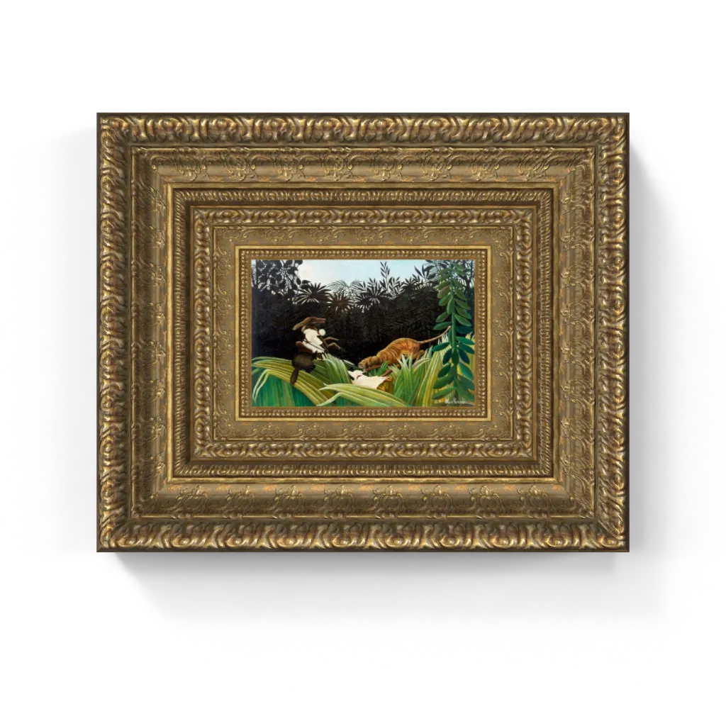 This captivating framed canvas reproduction of Henri Rousseau’s Scouts Attacked by a Tiger has undergone meticulous digital restoration, unlocking an astonishing clarity and vibrant fidelity that is truly unparalleled. The process has revived the lush, deep greens of the jungle foliage and the exquisite texture of the meticulously rendered figures and animals with precision. This meticulous attention ensures this masterpiece comes to life on canvas with breathtaking authenticity, offering a truly stunning physical experience that restores the painting's original, dreamlike splendor and profound drama.