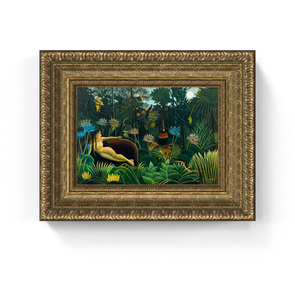 This mesmerizing framed canvas reproduction of Henri Rousseau’s The Dream has undergone meticulous digital restoration, unlocking an astonishing clarity and vibrant fidelity that is truly unparalleled. The process has revived the lush, deep greens of the dense jungle and the exquisite surrealism of the luminous moonlight with precision, ensuring every stylized form and subtle detail is perfectly rendered. This meticulous attention ensures this masterpiece comes to life on canvas with breathtaking authenticity, offering a truly stunning physical experience that preserves the painting's original, dreamlike splendor and profound mystery.