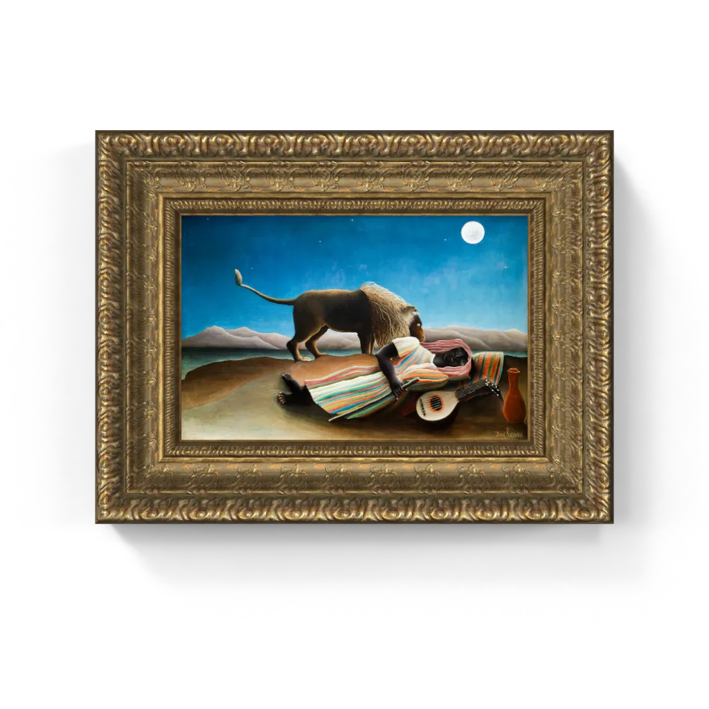 This mesmerizing framed canvas reproduction of Henri Rousseau’s The Sleeping Gypsy has undergone meticulous digital restoration, unlocking an astonishing clarity and vibrant fidelity that is truly unparalleled. The process has revived the deep, rich saturation of the night sky and the luminous glow of the full moon with exquisite precision, ensuring every stylized form and subtle detail of the enigmatic landscape is perfectly rendered. This meticulous attention ensures this masterpiece comes to life on canvas with breathtaking authenticity, offering a truly stunning physical experience that restores the painting's original, dreamlike splendor and profound mystery.