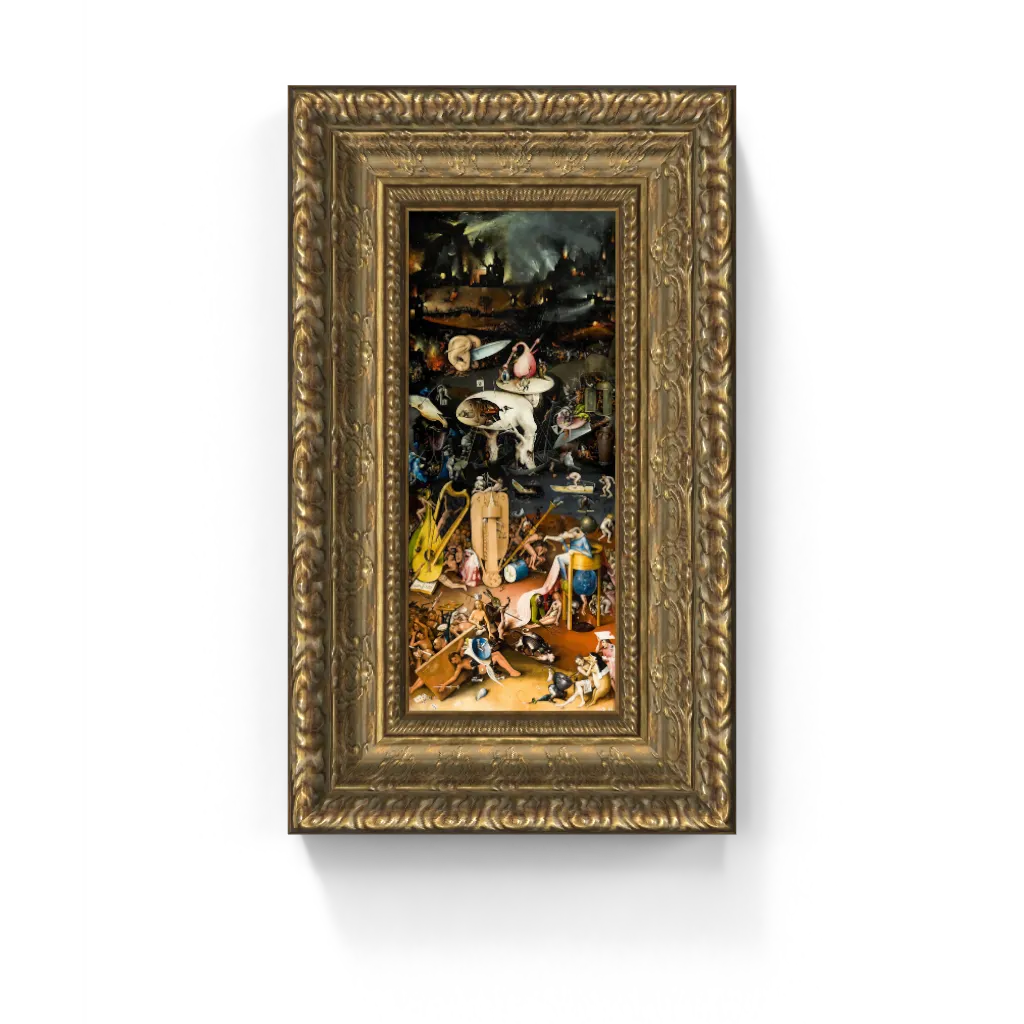 This iconic framed canvas reproduction of Hieronymus Bosch’s The Garden of Earthly Delights, Hell has undergone meticulous digital restoration, unlocking an astonishing clarity and vibrant fidelity that is truly unparalleled. The process has revived the profound psychological intensity of the dark palette and the intricate texture of the nightmarish forms with incredible precision, ensuring every grotesque figure and bizarre detail is perfectly rendered. This meticulous attention ensures this masterpiece comes to life on canvas with breathtaking authenticity, offering a truly stunning physical experience that preserves the painting's original, terrifying power and profound artistic vision.