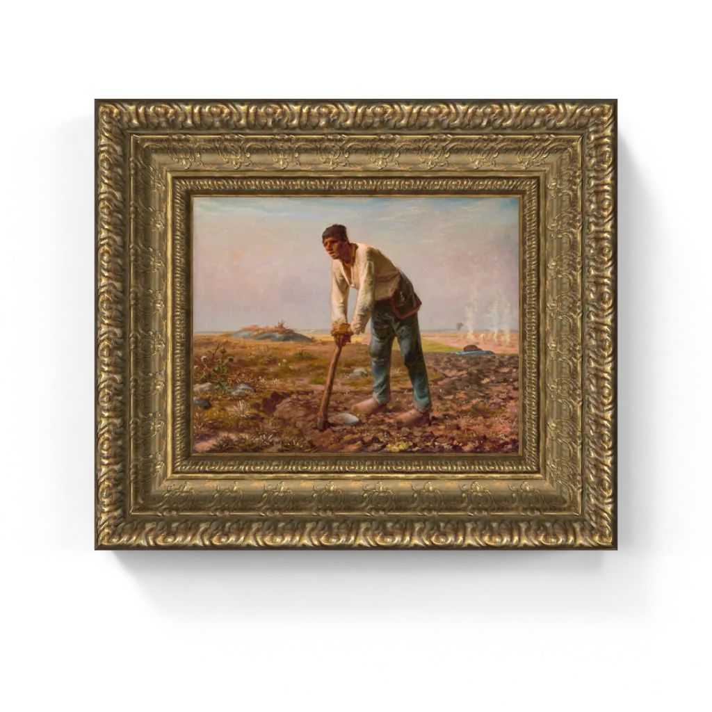 This compelling Jean-François Millet canvas print presents a solitary figure, bent and weathered, resting momentarily from the back-breaking task of tilling the slatex with his hoe. Millet, a towering figure in the Realism art movement and a core member of the Barbizon School, imbued this rural scene with a stark truthfulness that challenged conventional academic art. "Man with a Hoe" sparked intense debate upon its exhibition for its perceived social and political implications, with some critics viewing the figure as a symbol of brutalized labor. Yet, Millet's intent was to convey the dignity of labor and the profound connection between the peasant and the land, rendering the figure with immense empathy and solemn beauty. It stands as an enduring icon of work and human perseverance.