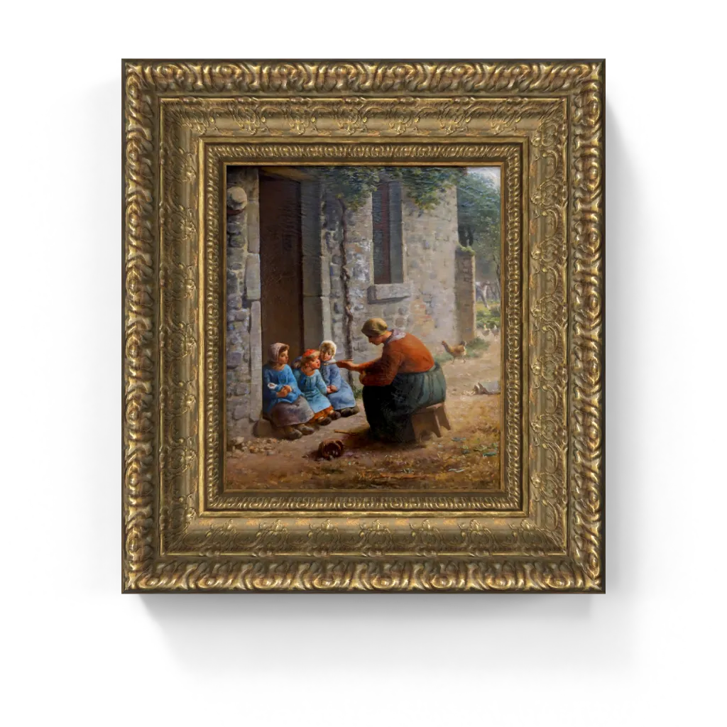 This museum-quality framed canvas reproduction faithfully preserves the original's gentle tones and delicate texture, ensuring a calming and authentic presence in your home. Ready to hang, it's an ideal piece for farmhouse decor, cottagecore aesthetics, or traditional interiors, bringing a touch of rustic charm, natural harmony, and the peaceful spirit of the countryside to any space. Elevate your decor with this timeless piece of 19th-century French art that celebrates life's nurturing gestures.