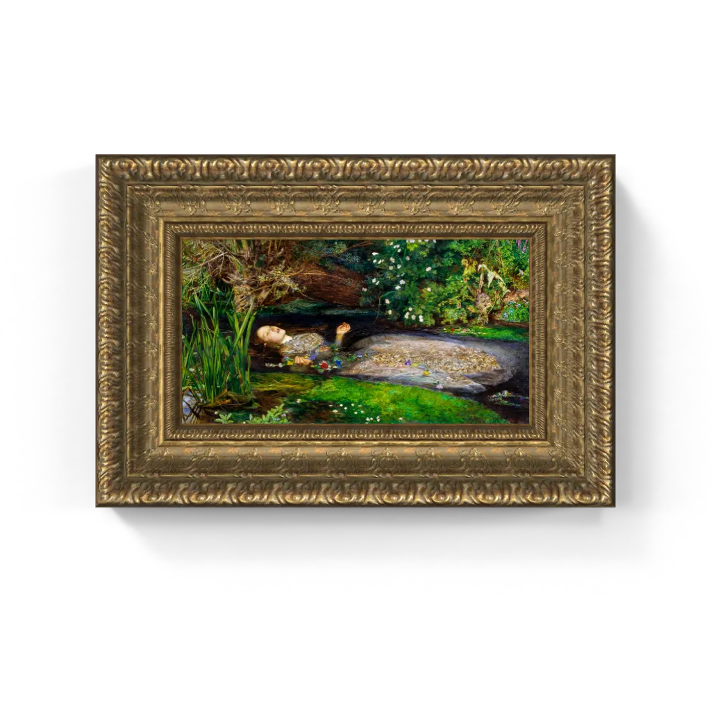 This iconic framed canvas reproduction of John Everett Millais’s Ophelia has undergone meticulous digital restoration, unlocking an astonishing clarity and vibrant fidelity that is truly unparalleled. The process has revived the jewel-like saturation of the water and the exquisite detail of the floral foreground with precision, ensuring every delicate petal, leaf, and submerged fold of the dress is perfectly rendered. This meticulous attention ensures this masterpiece comes to life on canvas with breathtaking authenticity, offering a truly stunning physical experience that preserves the painting's original, compelling splendor and profound artistic vision.