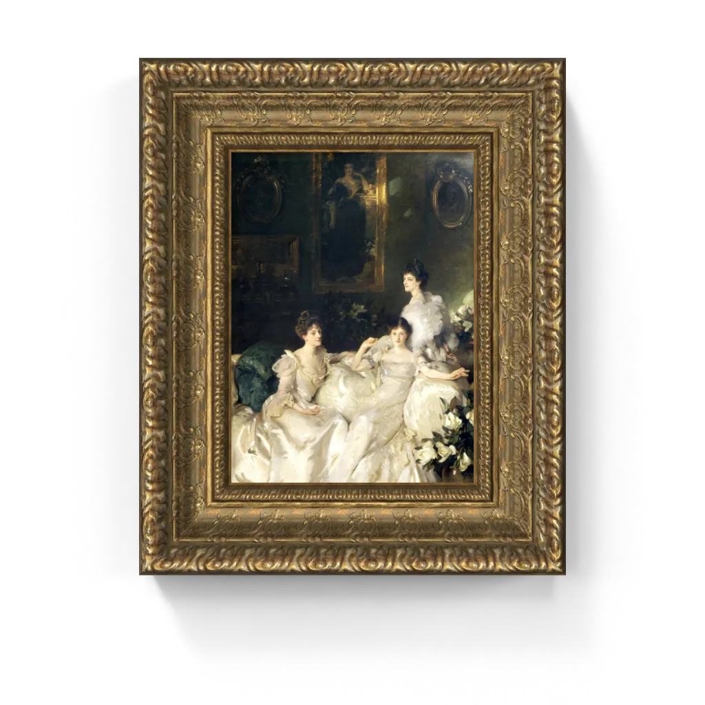 Sargent captures each sister with her own distinctive beauty and poise, draped in luxurious white gowns that shimmer under soft light. The figures are arranged in a deliberate visual harmony, their placement echoing classical ideals while radiating modern charm and social confidence. The floral upholstery, gilded frame, and painterly brushwork reflect Sargent’s mastery of both realism and decorative richness.