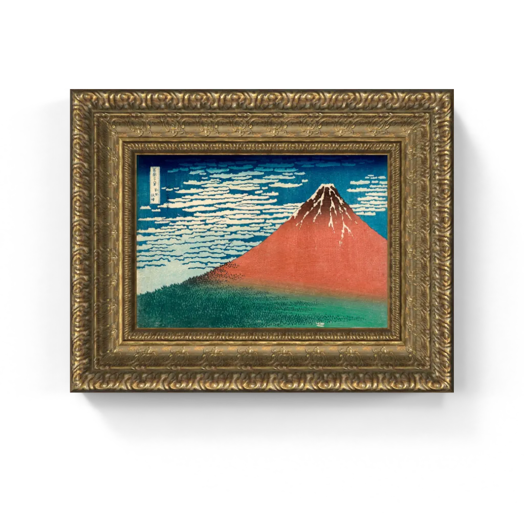 This iconic framed canvas reproduction of Katsushika Hokusai’s Fine Wind, Clear Weather has undergone meticulous digital restoration, unlocking an astonishing clarity and vibrant fidelity that is truly unparalleled. The process has revived the incandescent brilliance of the famed "Red Fuji" and the exquisite depth of the Prussian blue sky with incredible precision, ensuring every delicate line and subtle shade is perfectly rendered. This meticulous attention ensures this masterpiece comes to life on canvas with breathtaking authenticity, offering a truly stunning physical experience that preserves the print's original, monumental grandeur and striking color.