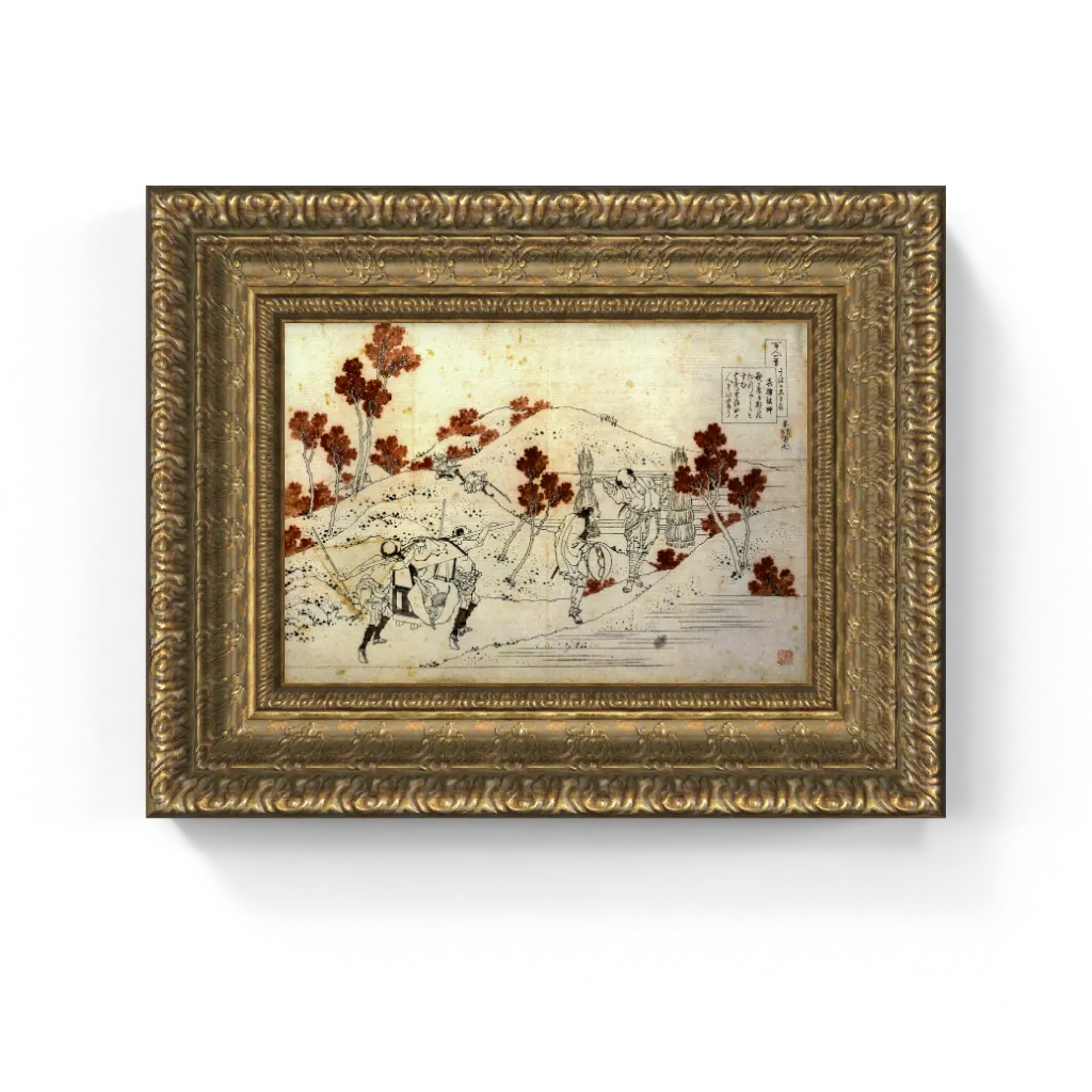 This captivating framed canvas reproduction of Katsushika Hokusai’s Kisen Hōshi has undergone meticulous digital restoration, unlocking an astonishing clarity and vibrant fidelity that is truly unparalleled. The process has revived the exquisite precision of Hokusai's linework and the subtle, earthy tones of the landscape and figures with incredible detail. This meticulous attention ensures this masterpiece comes to life on canvas with breathtaking authenticity, offering a truly stunning physical experience that preserves the print's original, poetic beauty and striking composition.