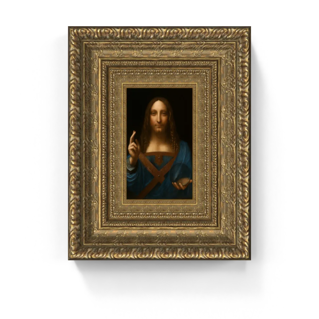 This exceptionally rare framed canvas reproduction of Leonardo da Vinci’s Salvator Mundi has undergone extensive digital restoration, unveiling a clarity and pristine state that dramatically surpasses other available versions. Where most reproductions reveal the deep cracks, abrasions, and past overpaintings inherent to the original's complex history, this meticulous process has unified the paint surface, reviving the astonishing vibrancy of Christ's luminous blue robe and the lifelike warmth of his skin. Critically, the breathtaking transparency and subtle refractive qualities of the crystal orb are now rendered with unparalleled fidelity, ensuring this masterpiece comes to life on canvas with breathtaking authenticity, offering a truly stunning physical experience that restores its profound original impact.