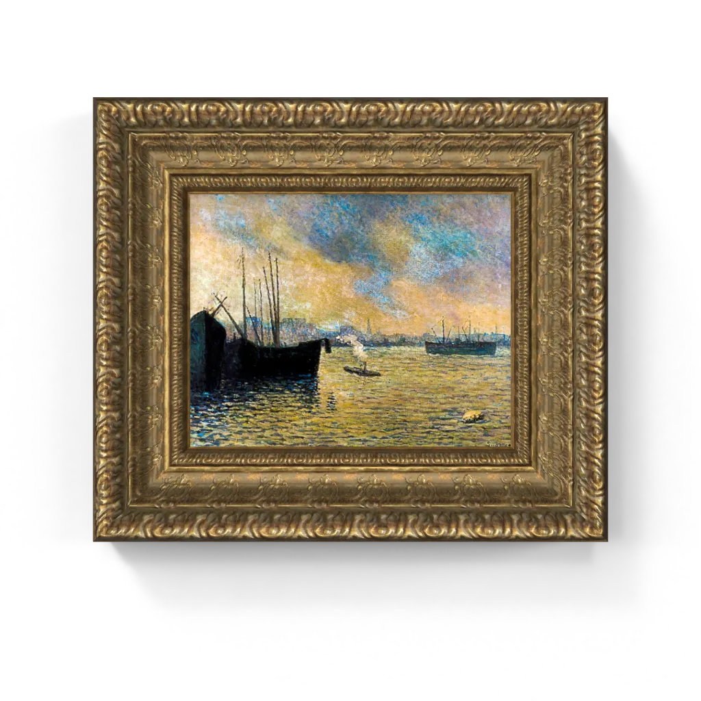 This captivating framed canvas reproduction of Maximilien Luce’s The Meuse at Feyenoord has undergone meticulous digital restoration, unlocking an astonishing clarity and vibrant fidelity that is truly unparalleled. The process has revived the luminous glow of the industrial atmosphere and the exquisite texture of every individual Pointillist dot with precision, ensuring the painting's intended visual vibration and atmospheric depth are perfectly realized. This meticulous attention ensures this masterpiece comes to life on canvas with breathtaking authenticity, offering a truly stunning physical experience that preserves the print's original, compelling vision and intricate detail.