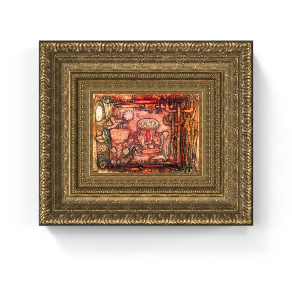 This captivating framed canvas reproduction of Paul Klee’s Botanical Theater has undergone meticulous digital restoration, unlocking an astonishing clarity and vibrant fidelity that is truly unparalleled. The process has revived the luminous glow of the warm, earthy tones and the exquisite texture of the intricate, painted surface with precision, ensuring every symbolic form and chaotic detail is perfectly rendered. This meticulous attention ensures this masterpiece comes to life on canvas with breathtaking authenticity, offering a truly stunning physical experience that preserves the painting's original, compelling splendor and profound artistic vision.