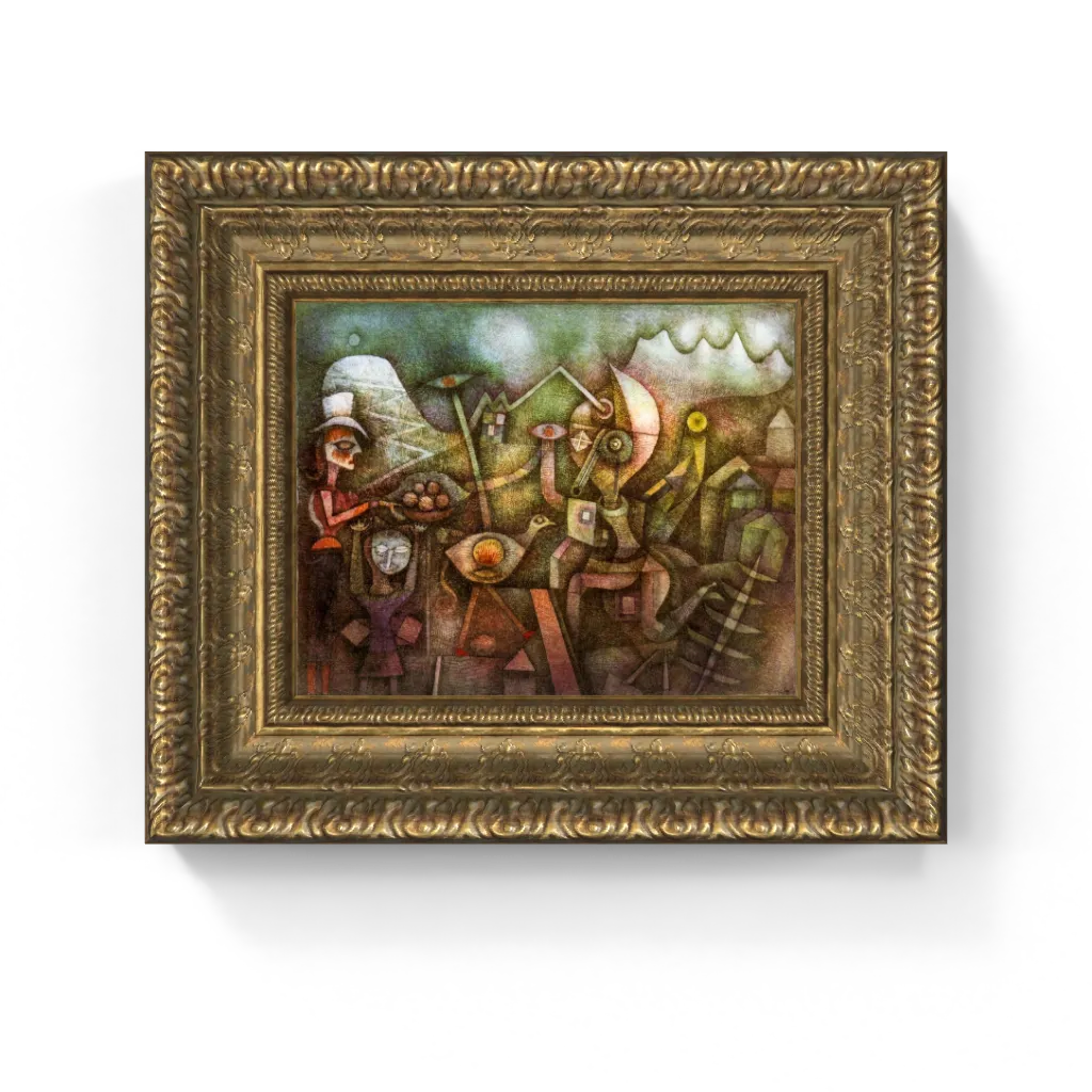 This captivating framed canvas reproduction of Paul Klee’s Carnival in the Mountains has undergone meticulous digital restoration, unlocking an astonishing clarity and vibrant fidelity that is truly unparalleled. The process has revived the luminous glow of the warm tones and the exquisite texture of the intricate, painted linework with precision, ensuring every symbolic form and chaotic detail is perfectly rendered. This meticulous attention ensures this masterpiece comes to life on canvas with breathtaking authenticity, offering a truly stunning physical experience that preserves the painting's original, compelling splendor and profound artistic vision.