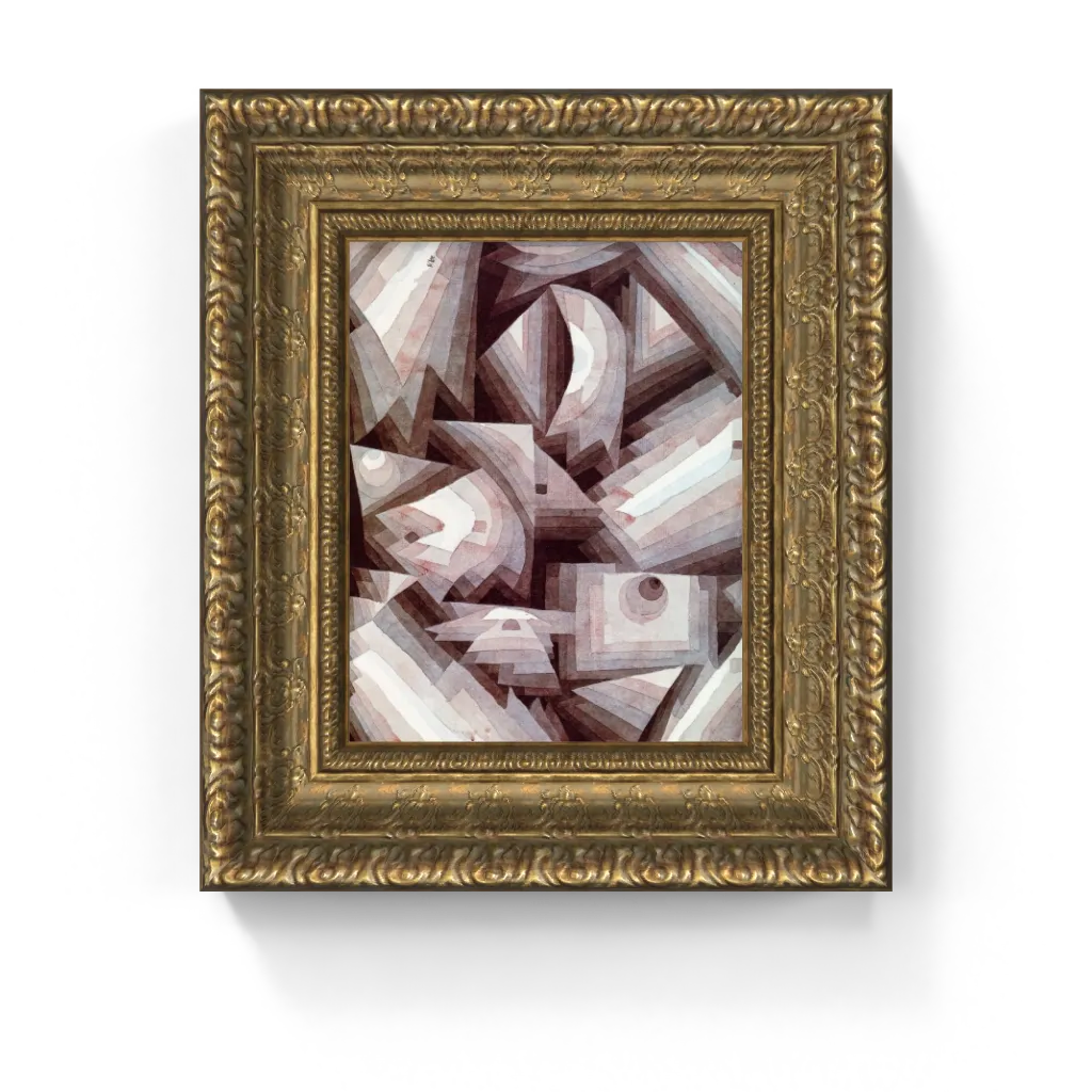 The canvas is a symphony of stylized forms and a striking palette of subtle, monochromatic tones. Overlapping geometric shapes—triangles, squares, and arches—are rendered with a delicate, transparent watercolor technique, creating a sense of both depth and movement. The luminous grays, browns, and pinks build a complex, mesmerizing structure that seems to shift and vibrate with a life of its own. Klee's masterful technique, combining geometric precision with an expressive, almost child-like spontaneity, gives the painting a sense of profound character and hidden meaning. This work is a powerful meditation on form, transformation, and the underlying order within the chaos of the natural world.