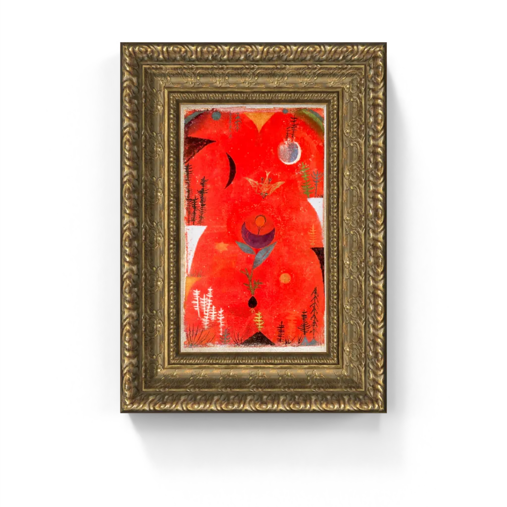 This captivating framed canvas reproduction of Paul Klee’s Flower Myth has undergone meticulous digital restoration, unlocking an astonishing clarity and vibrant fidelity that is truly unparalleled. The process has revived the luminous glow of the incandescent red and the exquisite detail of the symbolic forms with precision, ensuring every delicate line and subtle shade is perfectly rendered. This meticulous attention ensures this masterpiece comes to life on canvas with breathtaking authenticity, offering a truly stunning physical experience that preserves the painting's original, compelling splendor and profound artistic vision.