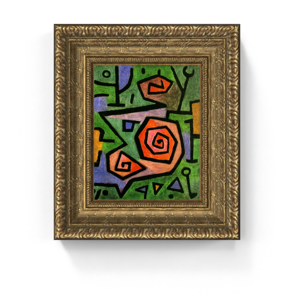 The canvas is a symphony of stylized forms and a striking palette of warm yellows, greens, and luminous reds and oranges. Klee's masterful technique, combining bold, black outlines with a textured, layered background, gives each abstract form a sense of individual character and hidden meaning. The "roses" themselves are not rendered realistically, but as dynamic, swirling geometric shapes that seem to pulse with a vibrant energy. The painting’s power lies in its ability to communicate a sense of strength and fragile beauty, not through realism, but through a visual language of form, line, and color that is both universal and deeply personal.
