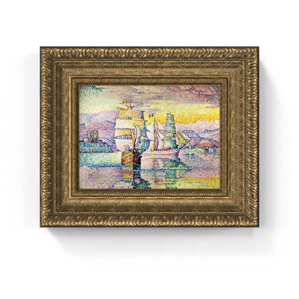 This captivating framed canvas reproduction of Paul Signac’s Antibes Harbour has undergone meticulous digital restoration, unlocking an astonishing clarity and vibrant fidelity that is truly unparalleled. The process has revived the luminous brilliance of the yellow sails and the ethereal pinks of the sky and clouds with exquisite precision, ensuring every delicate dot of color contributes to the scene's radiant harmony. This meticulous attention ensures this masterpiece comes to life on canvas with breathtaking authenticity, offering a truly stunning physical experience that preserves the print's original, dazzling light and intricate texture.