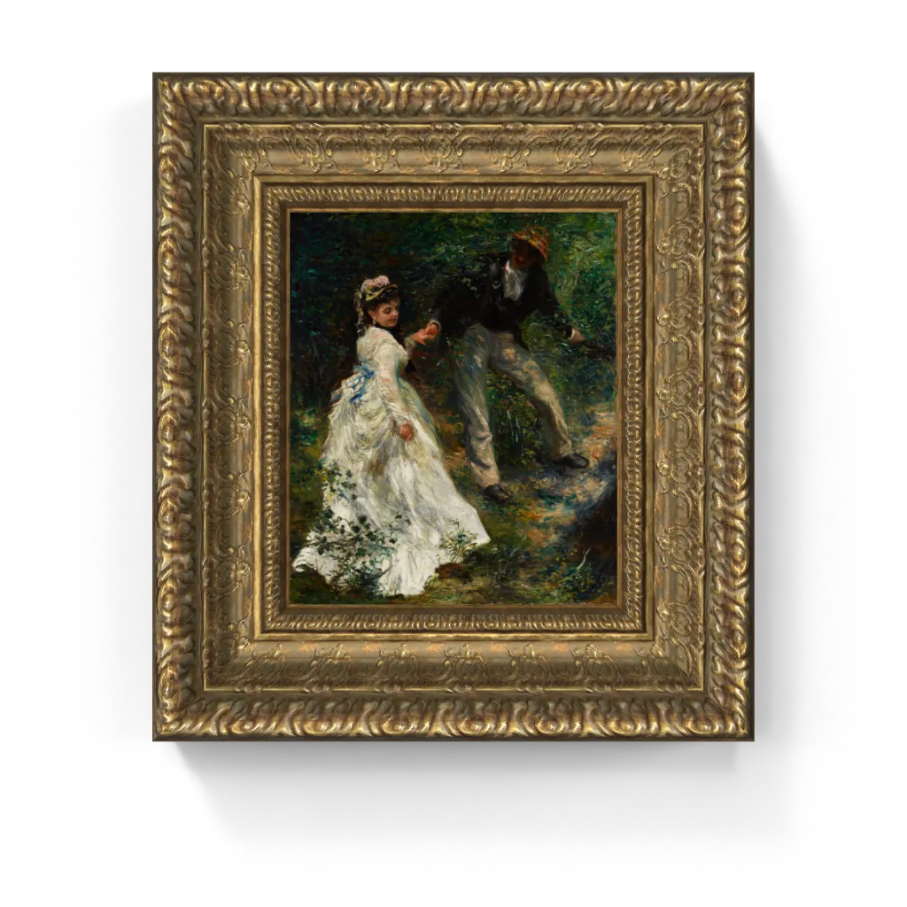The composition features a young couple walking along a wooded path, the woman gently guided by her companion. Her delicate dress flows with movement, subtly catching the golden light filtering through the trees. There’s a softness to the scene—a suggestion of courtship, gentility, and fleeting connection. Renoir’s loose brushwork and soft color palette transform a quiet walk into a poetic moment suspended in time.