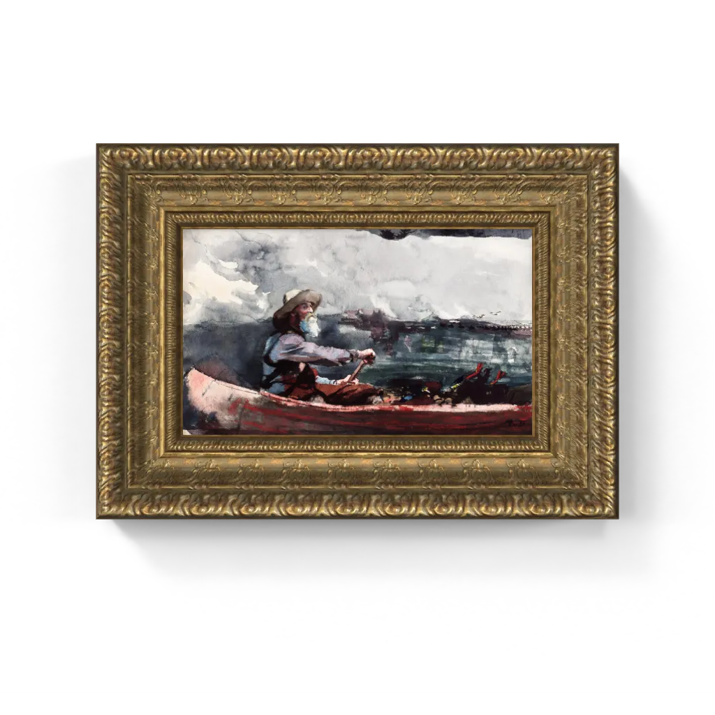 Rendered in earthy tones and composed with striking simplicity, the figure is solid, weathered, and alert. Homer’s characteristic realism shines in the natural textures of bark, moss, and worn clothing, while the atmosphere is cool, still, and watchful. This painting is more than a portrait—it’s a meditation on man’s place in the wild, and the quiet dignity of those who know its paths.