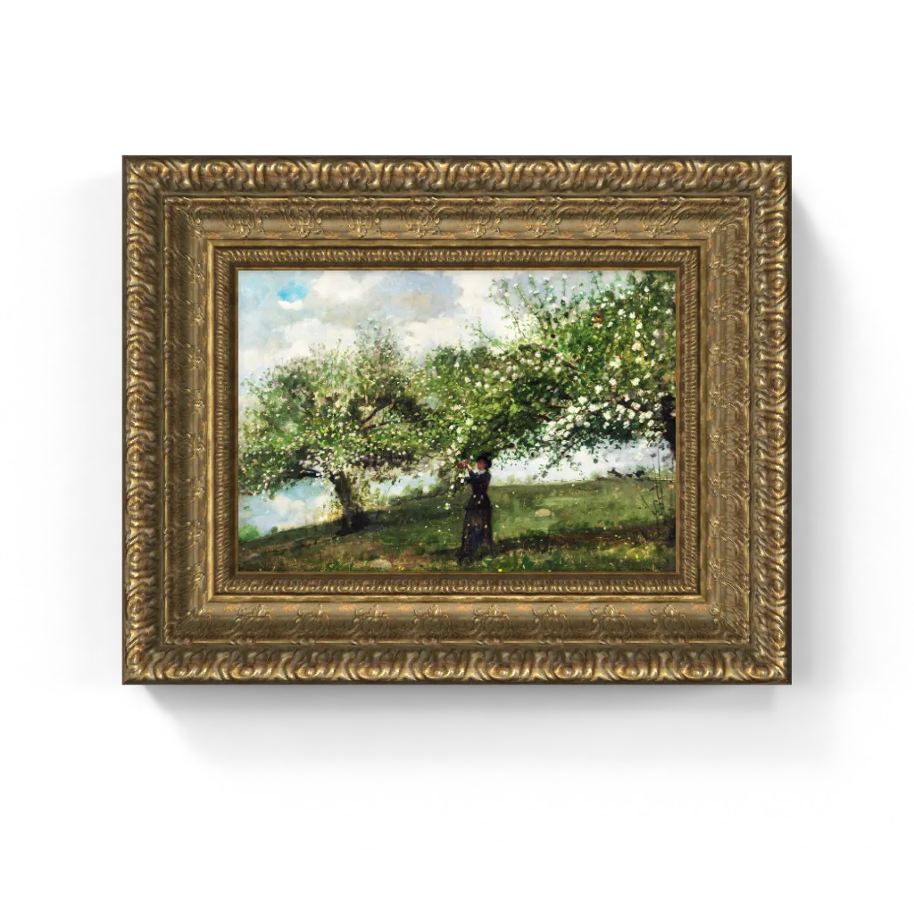 Step into the fragrant calm of springtime with Girl Picking Apple Blossoms, Winslow Homer’s delicate 1878 celebration of innocence, nature, and rural grace. Set in a blooming orchard, the painting features a young girl reaching gently into a flowering apple tree—capturing a fleeting moment of youth, sunlight, and seasonal beauty.