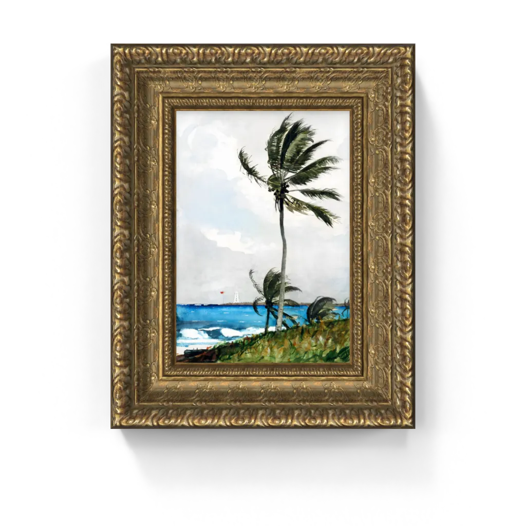 With its bold silhouette, bright sky, and glowing tropical tones, the painting is a masterclass in color harmony and compositional clarity. Homer’s brushwork is fluid yet deliberate—capturing both the delicate movement of palm fronds and the strength of the tree’s upright form. Set against a backdrop of blue water and pale architecture, the palm becomes a symbol of serenity, resilience, and island life.