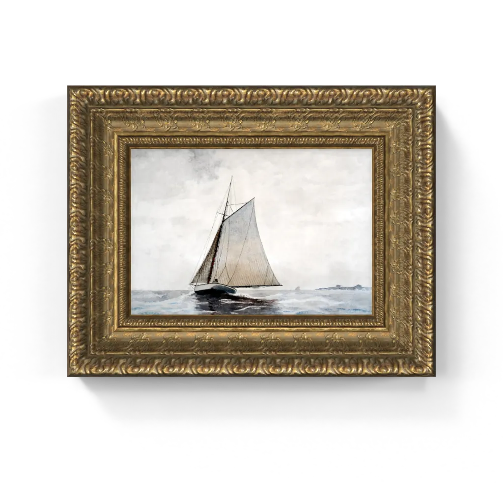 Homer’s brushwork is loose yet purposeful, with shimmering blues and sun-warmed whites that evoke the movement of waves and the fleeting energy of wind. With economy and elegance, he renders the schooner, the figures, and the glinting horizon—focusing not on dramatic narrative but on the purity of experience: men at work, nature in motion, and the quiet exhilaration of the open sea.